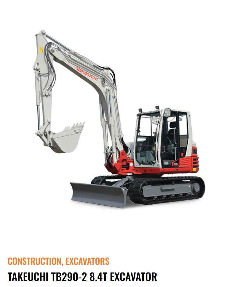 The Takeuchi TB290-2 8.4T Excavator has a wide array of features that maximize efficiency and productivity. A closed center,load sensing hydraulic system allows the TB290-2 to have outstanding multi-function capabilities, and the attachment presets greatly expands the machines versatility. The cabin on the Takeuchi TB290-2 Excavator is spacious and well appointed. A large color monitor keeps the operator informed of critical machine functions. The auxiliary flow rates can be adjusted from the operator’s seat.