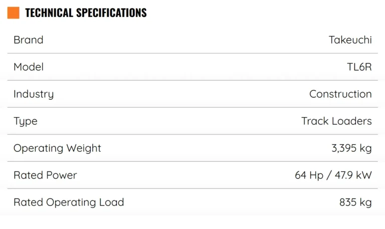 The Takeuchi TL6R Track Loader features a radial lift loader design and meets all current emission standards. With a height of 6 ft 5.8 in and a width of just over 5 ft the dimensions of the TL6R Track Loader allow it to excel on job sites that may have height and width restrictions. This Takeuchi track loader comes with a newly designed cabin with an overhead 5.7” color multi-informational display and backlit rocker switches that control a variety of machine functions. The Takeuchi TL6R comes standard with a quiet track design with flotation pads that reduces vibration, noise levels, and improves ride quality.